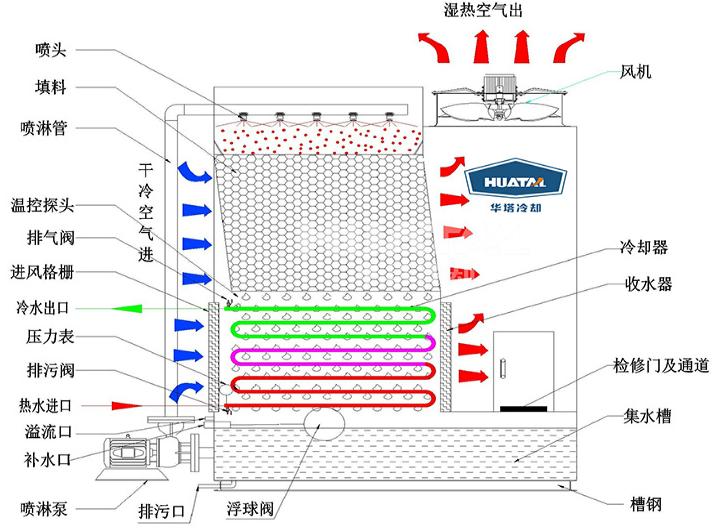 橫流閉式冷卻塔特點結構外板:使用進口鍍鎂鋁鋅外板,防腐效果突出,使用壽命是鍍鋅板的10-20倍,其表面的涂層具有流動性,具備切口保護(自愈合維護:占地面積小,設有檢修通道,可快速檢修;冷卻器在冷卻塔底部,雙面檢修,橫流閉式冷卻塔方便日常維護噴淋系統:噴淋水把冷凝器外壁完全淋濕,形成包裹狀,避免在干點部位形成水垢,將系統效率提高到大程度脫水器:高效的脫水器,具有可改變風向三次以上的通道結構,漂水率低填料:PVCdm料一一臺塑原生料,真空吸塑一次成型、漂水率低。具有非常強的抗寒凍性能,優良的親水性,熱力性能和抗腐蝕能力。填料片為難燃型材料。而且其防腐爛、抗衰減或生物侵害方面是換熱界好的,橫流閉式冷卻塔使用壽命長。